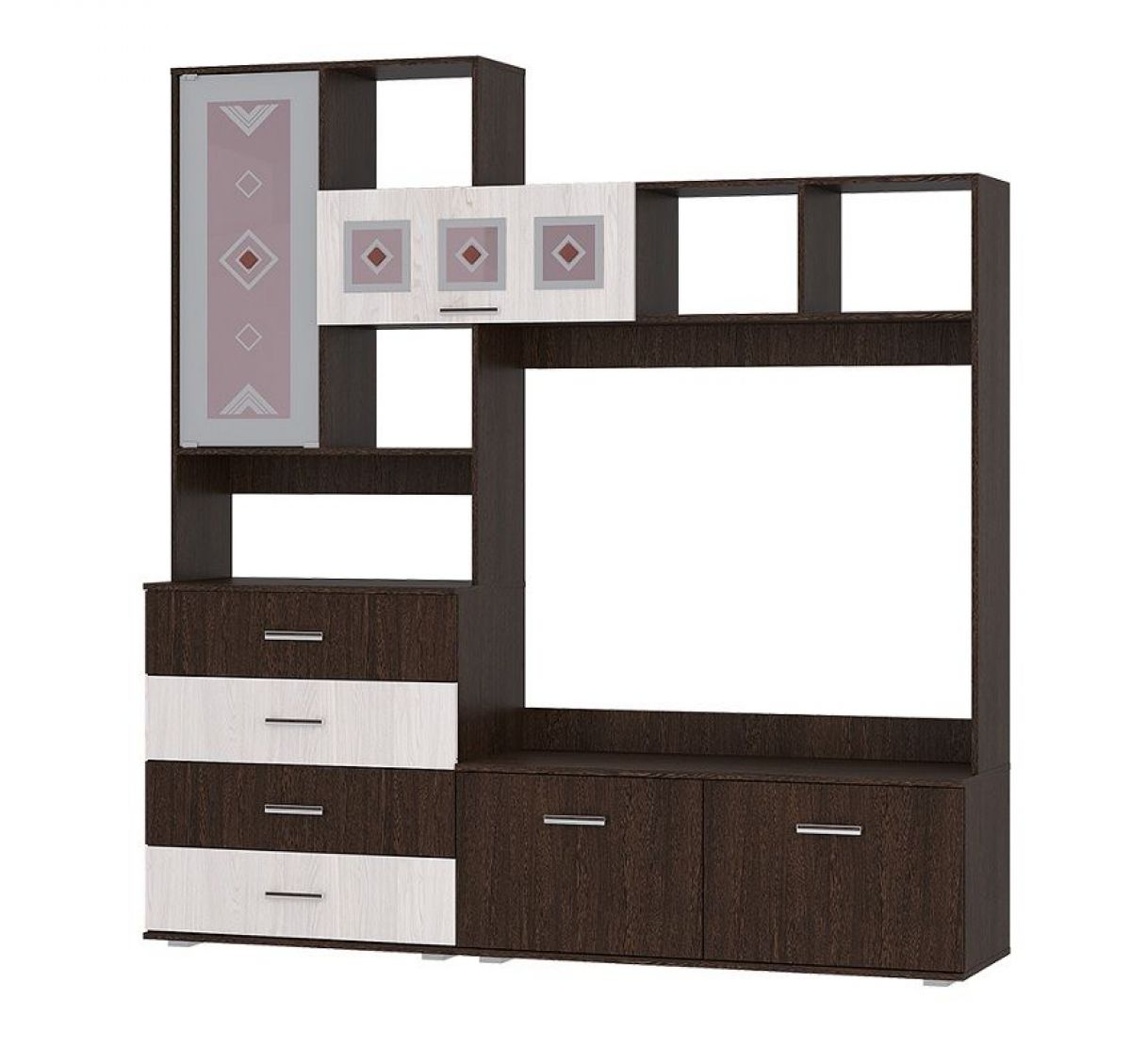 Модульная гостиная Белла - это функциональная стилизованная модель с простыми геометрическими формами. Особый шарм ей придаёт контрастное решение фасада в цветовом сочетании венге/дуб атланта, а также отделка зеркалами с фьюзингом (художественные вставки из цветного стекла), пескоструйной обработкой и еврокромкой.