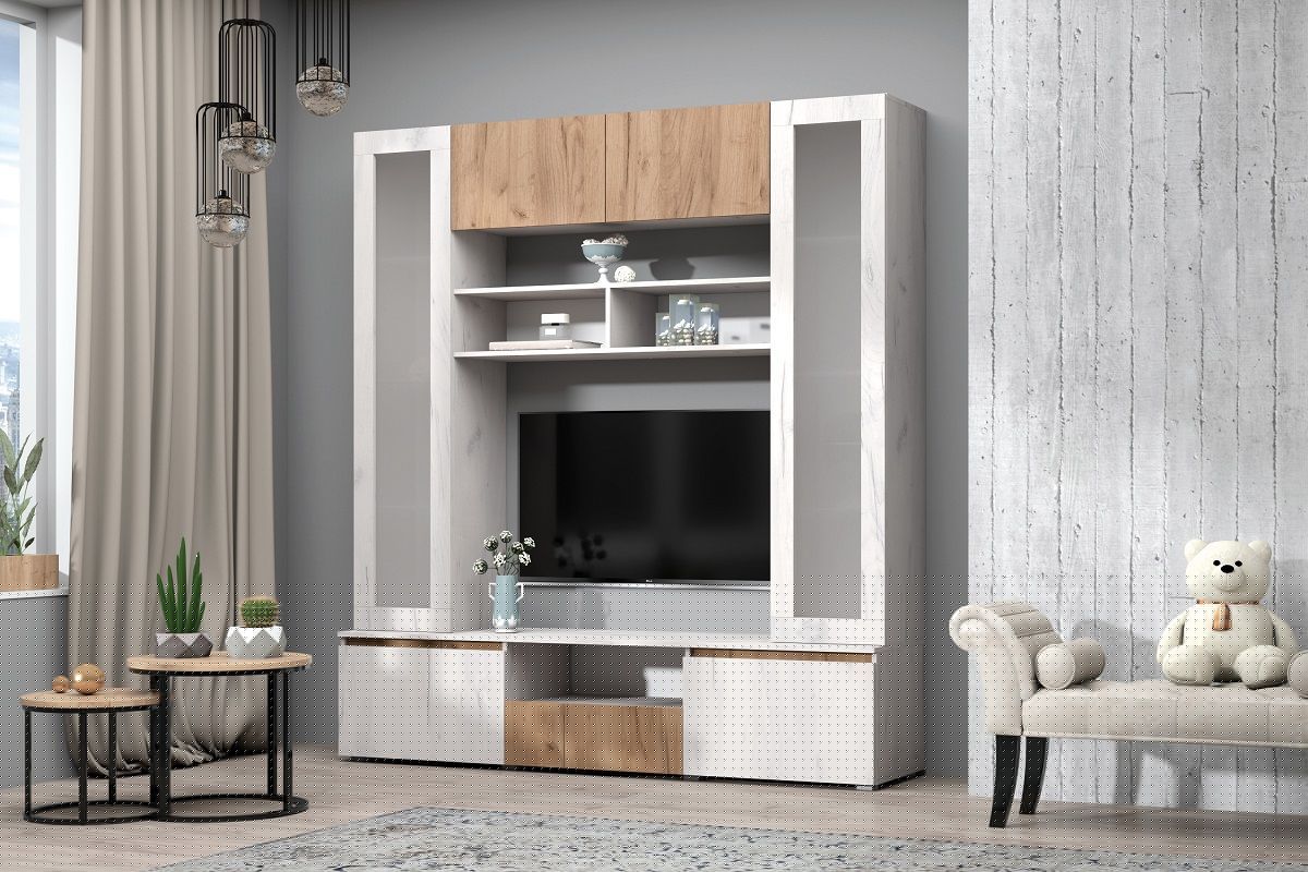 Образованная ими ниша под ТВ позволяет разместить телевизор широкого размерного ряда, который можно разместить как на стене, так и на тумбе.
