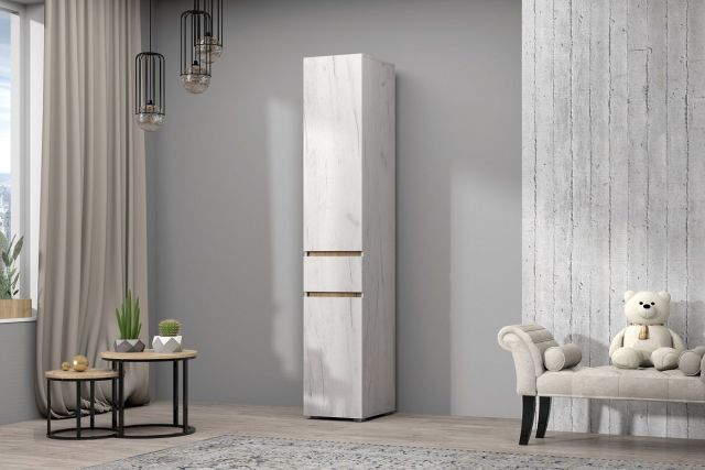 Изящная и функциональная модульная гостиная "Лиана" прекрасно дополнит современный дизайн Вашего пространства, придаст ему легкости и невесомости. Шкаф данной модульной гостиной включает в себя распашные дверцы и выдвижной ящик глубиной 400мм на шариковых направляющих полного выдвижения. В соответствии с Вашими пожеланиями верхняя секция шкафа может содержать полки, либо металлическую штангу для вешалок, так как оба варианта входят в комплект.